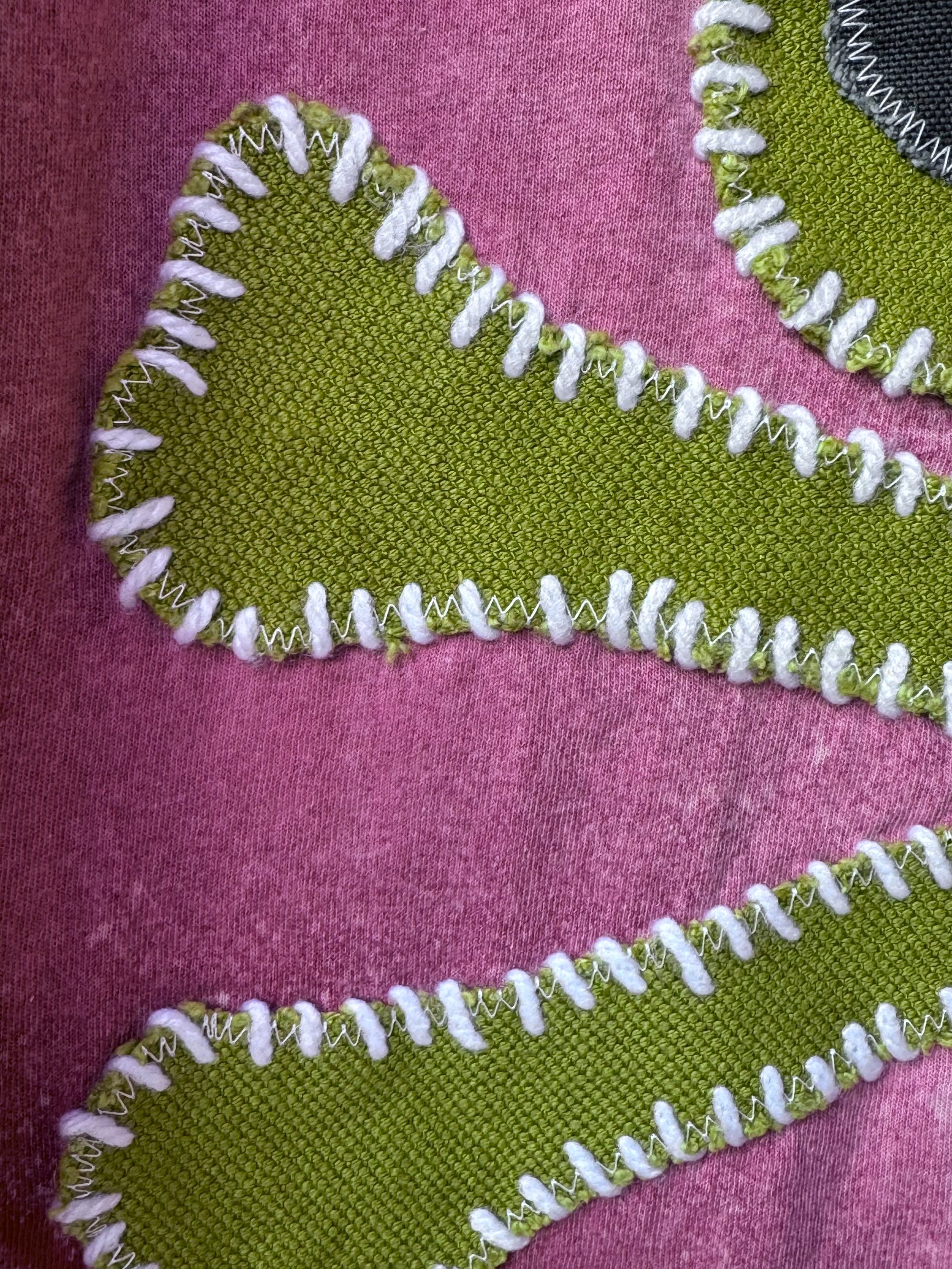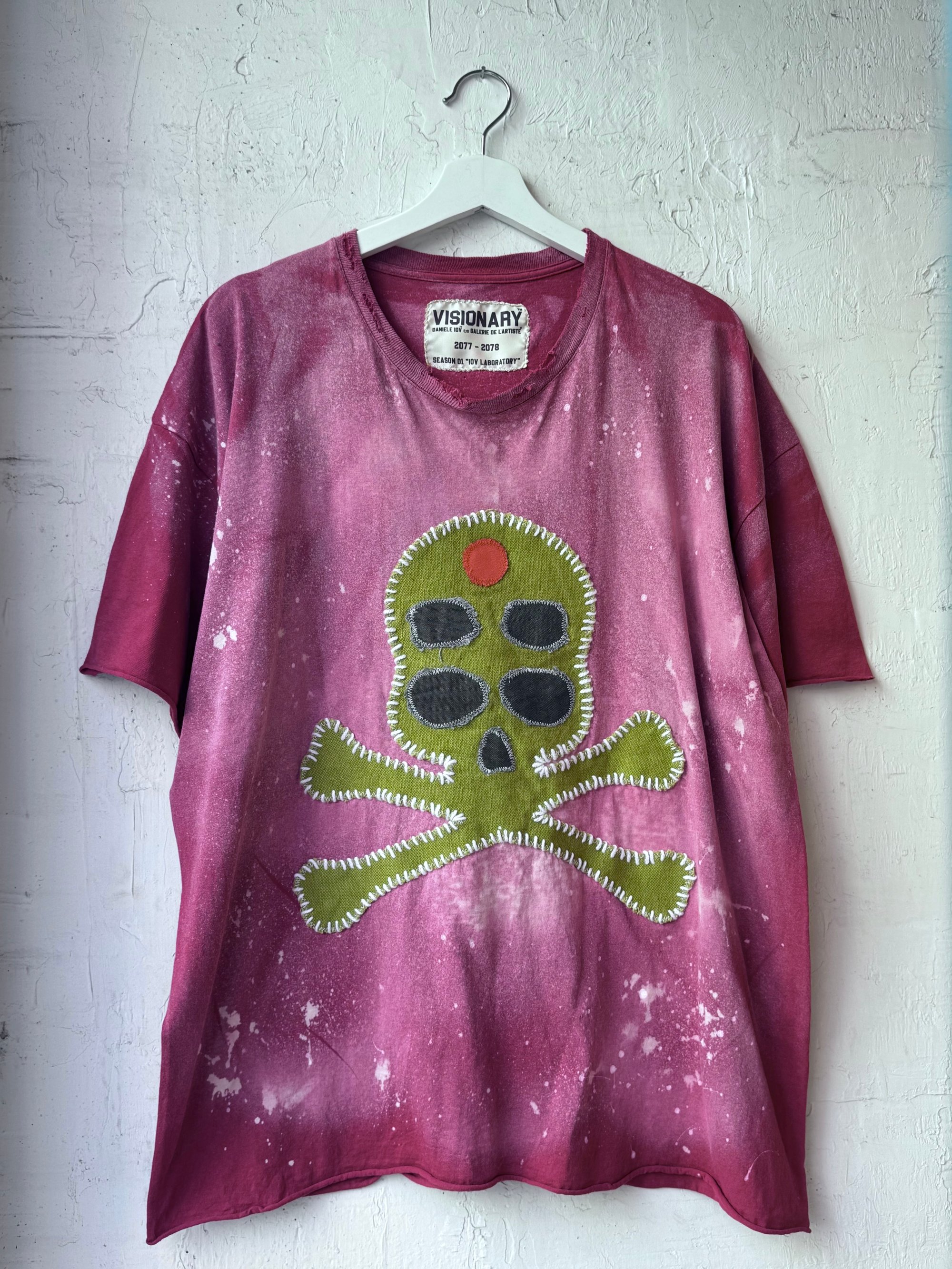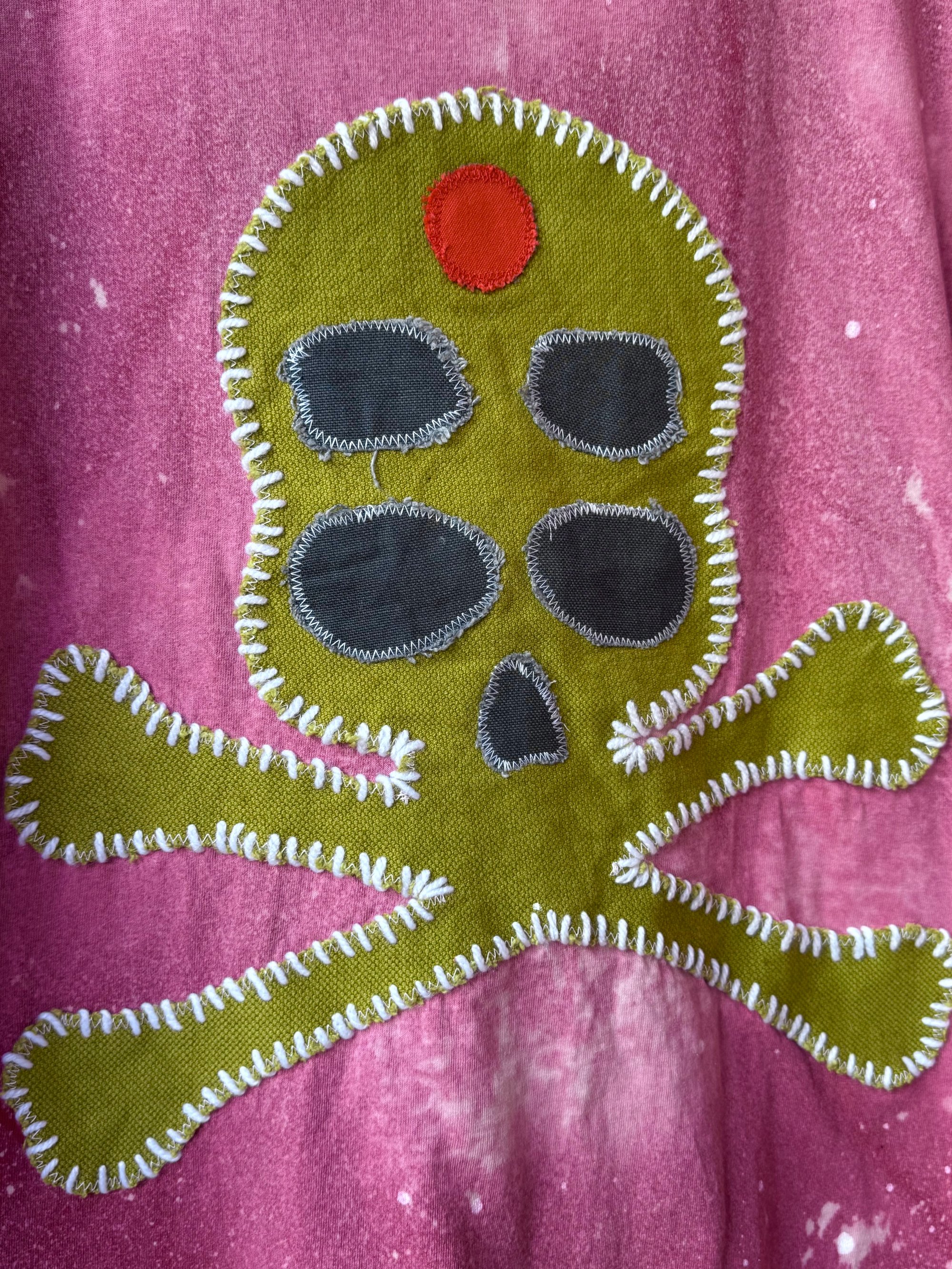 La patch “SKULL” frontale emerge come elemento primitivo, costruita e fissata con centinaia di punti eseguiti rigorosamente a mano.